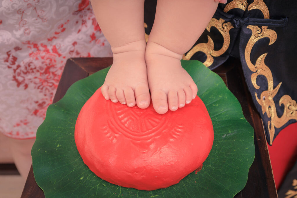 俗稱花生,因營養價值極高,長於滋養補益,有助於延年益壽,固有長生豆之稱,讓幼兒摸長生豆以祈求能健康長壽。